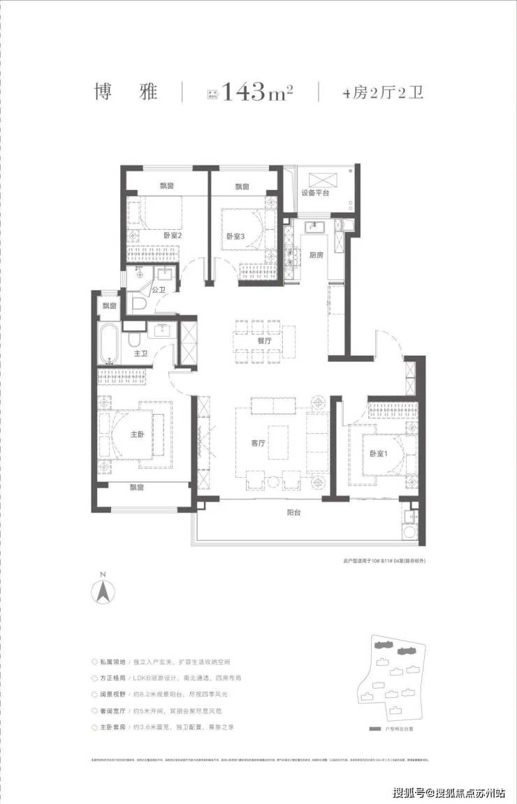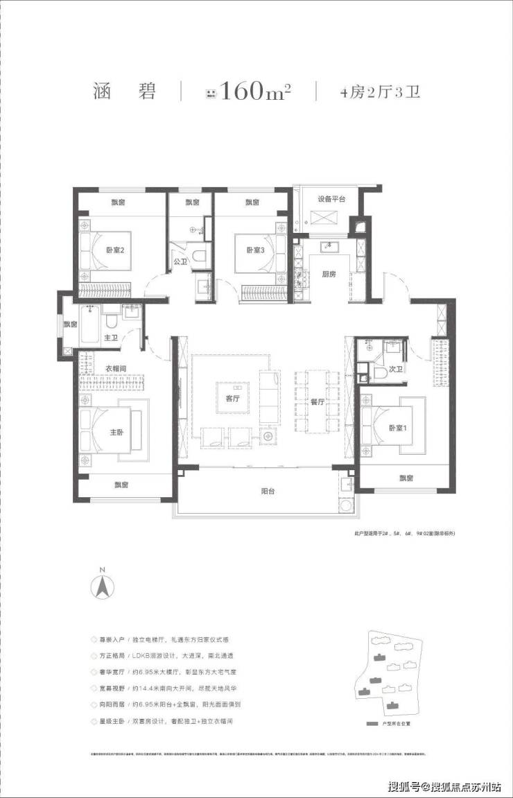 功能布局:有建面约143㎡、160㎡、180㎡三种户型,均为四房设计。143㎡户型有独立入户玄关,LDKB洄游设计,南北通透,约8.2米观景阳台,约5米开间;180㎡户型约6米餐客厅、约9m的大阳台,独立家政间、小家化的主卧套房。