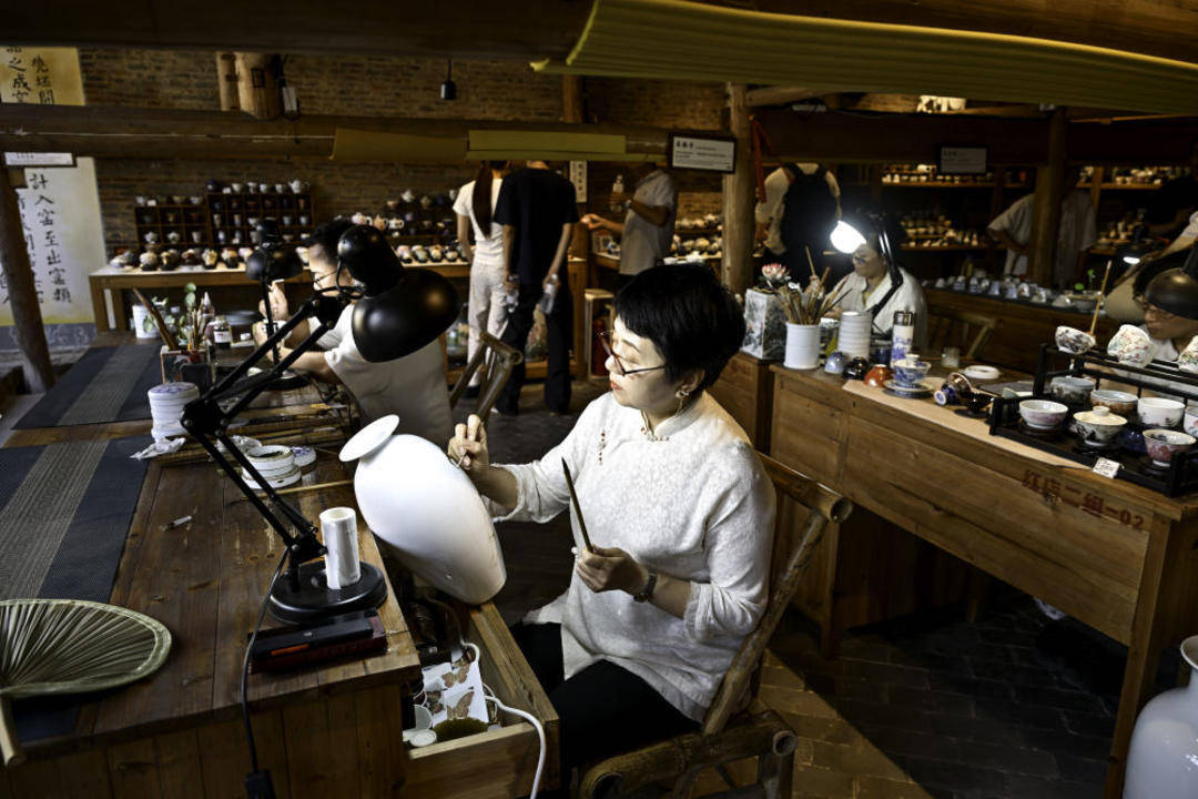 2025年7月13日,国家级非遗传统粉彩瓷制作技艺代表性传承人傅长敏(中)等陶瓷手工技艺传承人在陶阳里历史文化街区进行现场创作。陶阳里历史文化街区地处景德镇城市中心地带,古有“陶阳十三里,烟火十万家”的说法。近年来,当地严格遵循保护第一、修旧如旧的要求,在留住历史文脉和城市记忆的同时,实现老城区改造向文化创意产业、旅游服务业的转型,成功入选首批城市更新典型案例。如今,陶阳里历史文化街区已经成为游客们的热门打卡地。