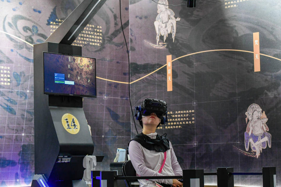 2024年7月22日,游客在“寻境敦煌——数字敦煌沉浸展”借助VR设备沉浸式游览莫高窟第285窟虚拟场景。“寻境敦煌——数字敦煌沉浸展”综合运用VR虚拟现实、三维建模、游戏引擎的物理渲染和全局动态光照等新技术,高精度立体还原了莫高窟第285窟。游客戴上VR眼镜,不仅可以零距离观赏壁画、360度自由探索洞窟细节,还能“飞升”到窟顶,身临其境参与壁画故事情节,沉浸式感受敦煌文化的魅力。