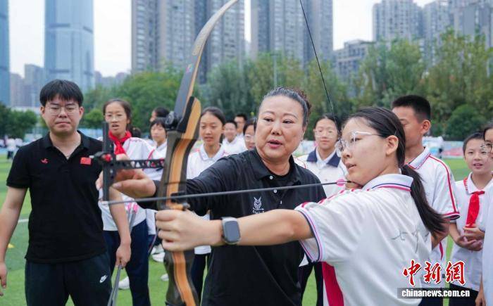 随后,李玲娟以第一棒火炬手的身份参与了运动会火炬传递。当她将火炬郑重交至第二棒庄弈程同学手中时,中华体育精神也在这一刻完成了薪火相传。在紧接着的“冠军体育课”上,学校操场秒变“射箭场”,李玲娟耐心地纠正孩子们的拉弓姿势,细致传授自己的实战心得与技巧。
